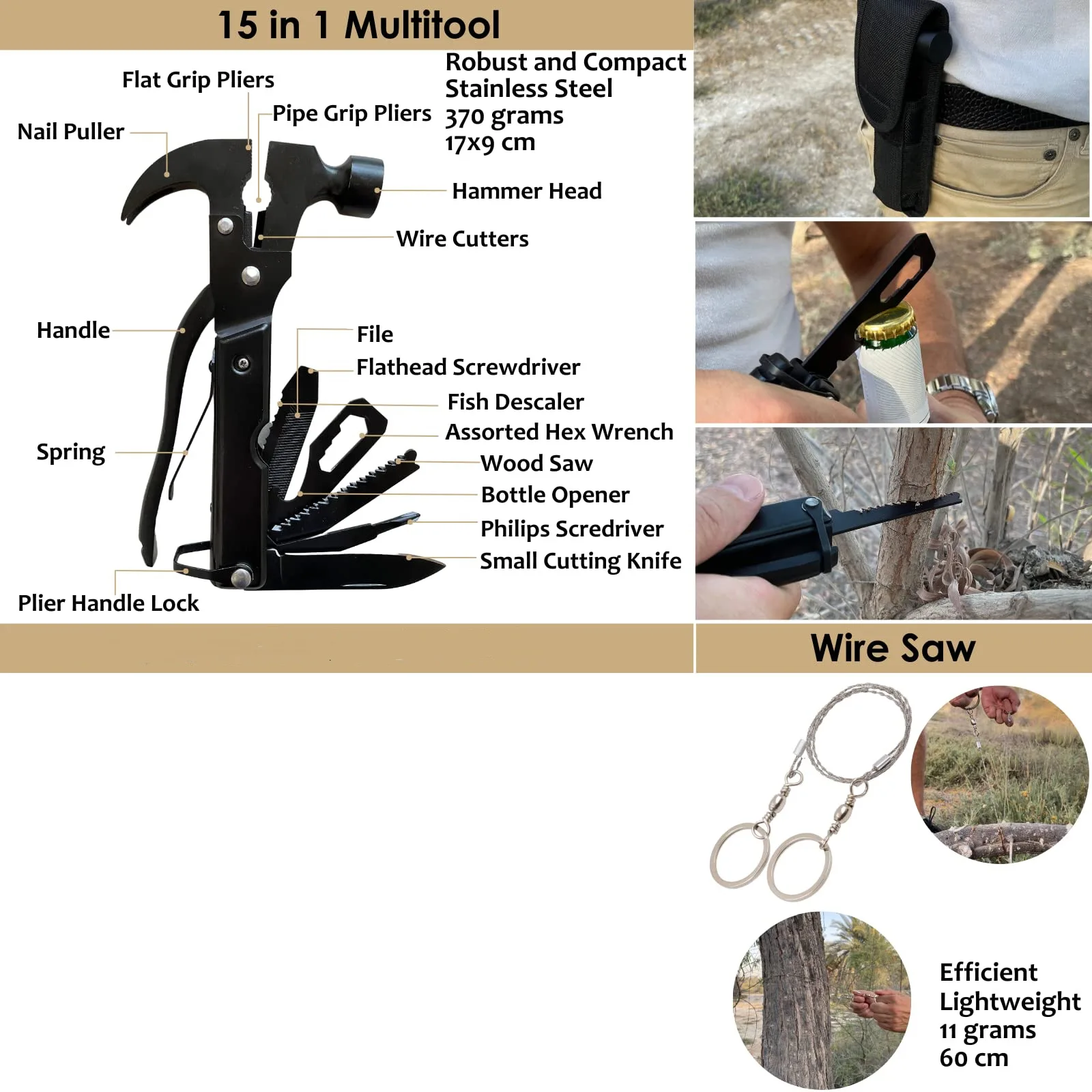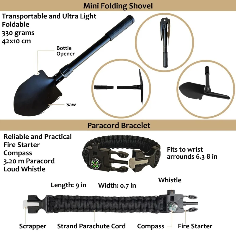 All-in-one survival solution: Combines first aid, emergency tools, and outdoor gear.